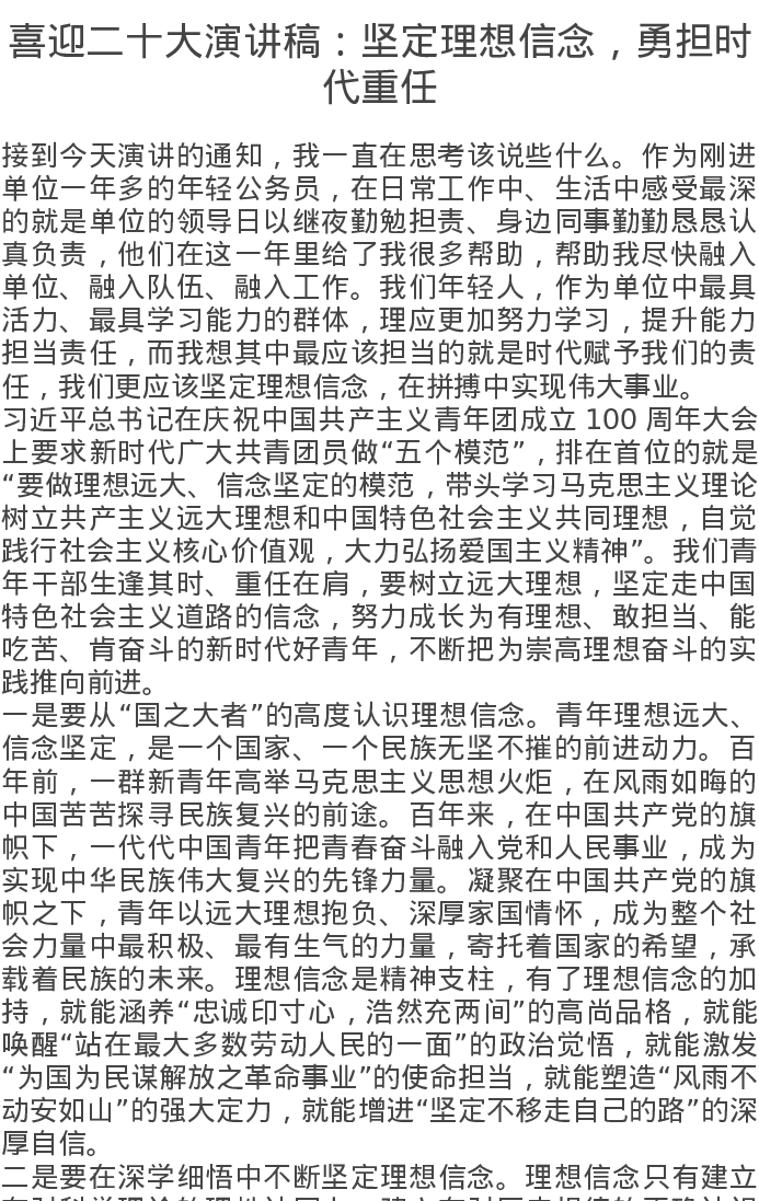 喜迎二十大演讲稿:坚定理想信念,勇担时代重任