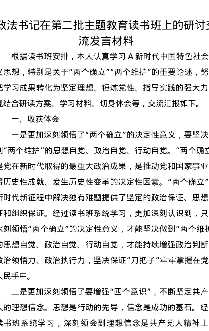 政法书记在第二批主题教育读书班上的研讨交流发言材料(特色社会主义思想)