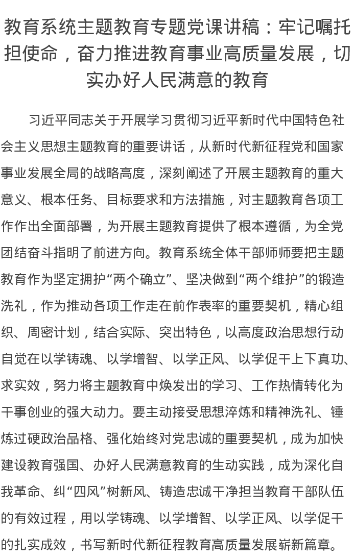 教育系统第二批主题教育专题党课讲稿:牢记嘱托担使命,奋力推进教育事业高质量发展,切实办好人民满意的教育(特色社会主义思想)