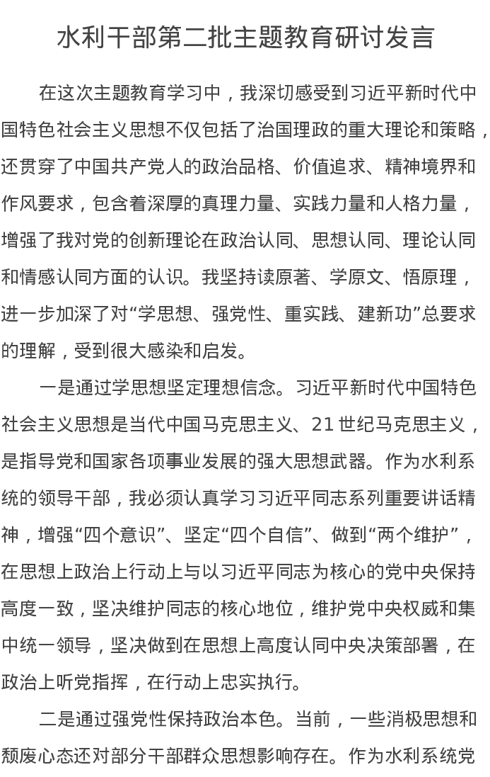 水利干部第二批主题教育研讨发言2(特色社会主义思想)