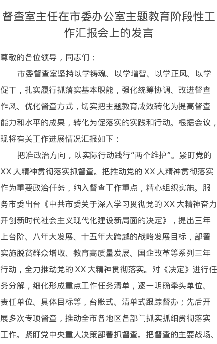 督查室主任在市委办公室第二批主题教育阶段性工作汇报会上的发言(特色社会主义思想)