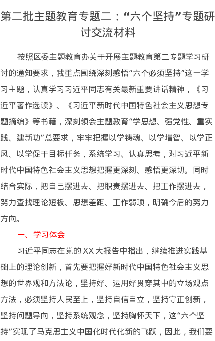第二批主题教育专题二:“六个必须坚持”专题研讨交流材料(特色社会主义思想)