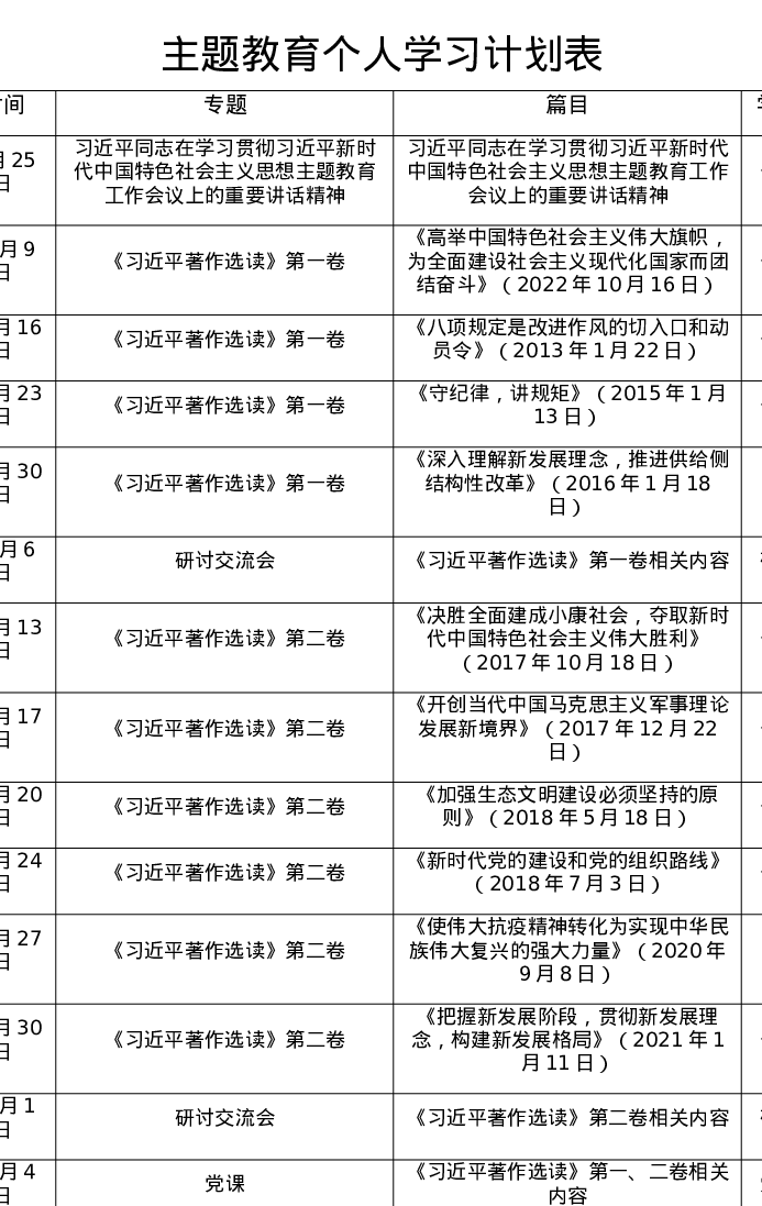 第二批主题教育个人学习计划表(特色社会主义思想)