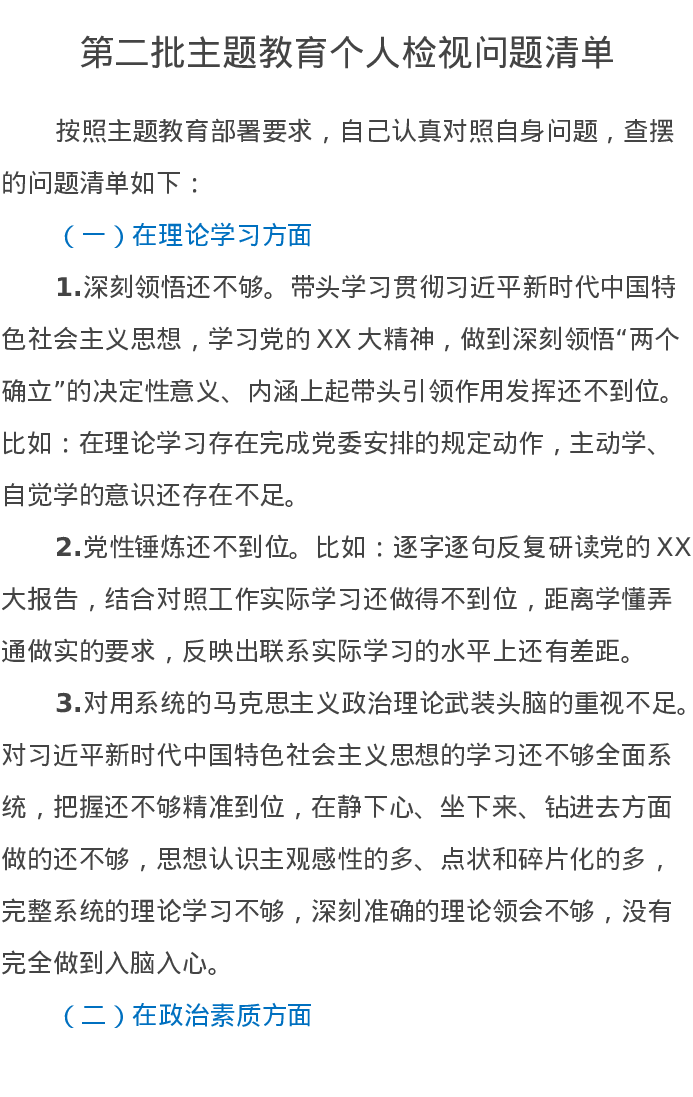 第二批主题教育个人检视问题清单(特色社会主义思想)