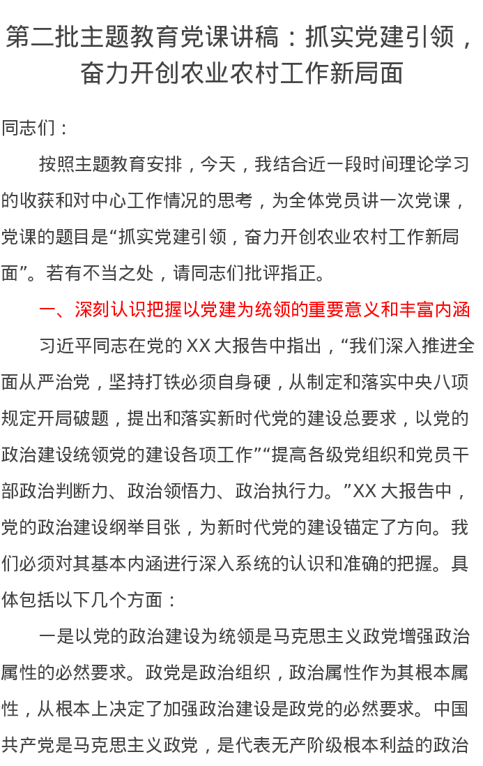 第二批主题教育党课讲稿:抓实党建引领,奋力开创农业农村工作新局面(特色社会主义思想)