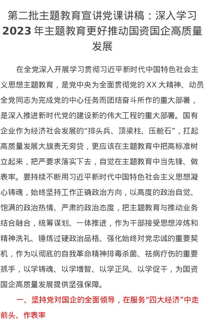 第二批主题教育宣讲党课讲稿:深入学习2023年主题教育更好推动国资国企高质量发展(特色社会主义思想)