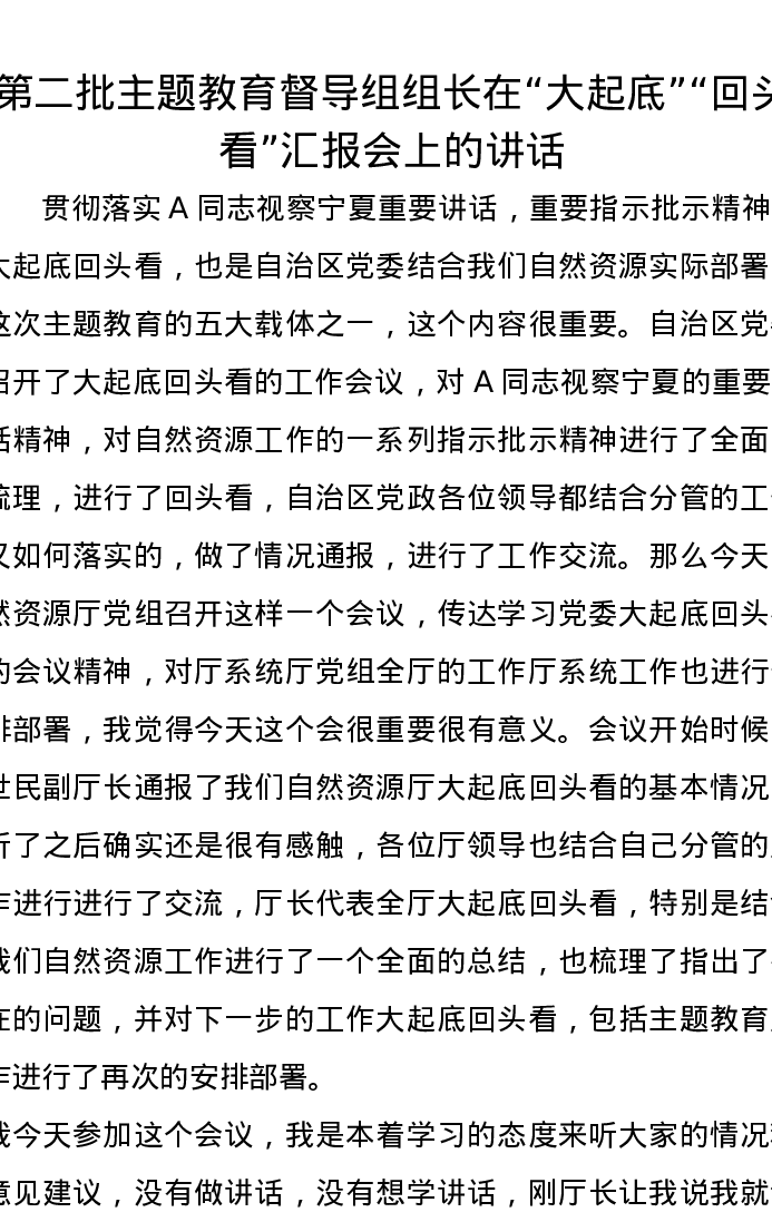 第二批主题教育督导组组长在“大起底”“回头看”汇报会上的讲话(特色社会主义思想)