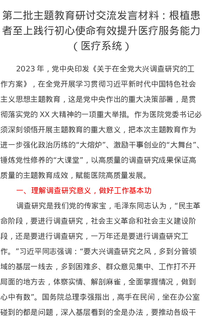 第二批主题教育研讨交流发言材料:根植患者至上践行初心使命有效提升医疗服务能力(医疗系统)