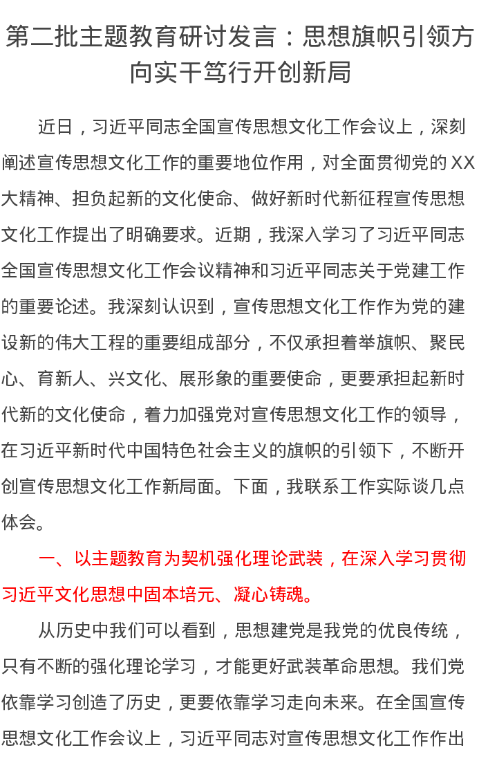 第二批主题教育研讨发言:思想旗帜引领方向实干笃行开创新局(特色社会主义思想)