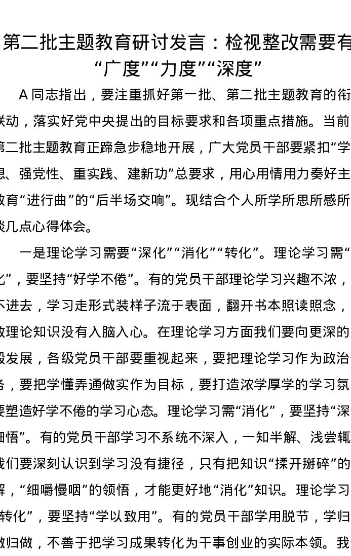 第二批主题教育研讨发言:检视整改需要有“广度”“力度”“深度”(特色社会主义思想)