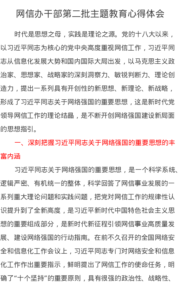网信办干部第二批主题教育心得体会(特色社会主义思想)