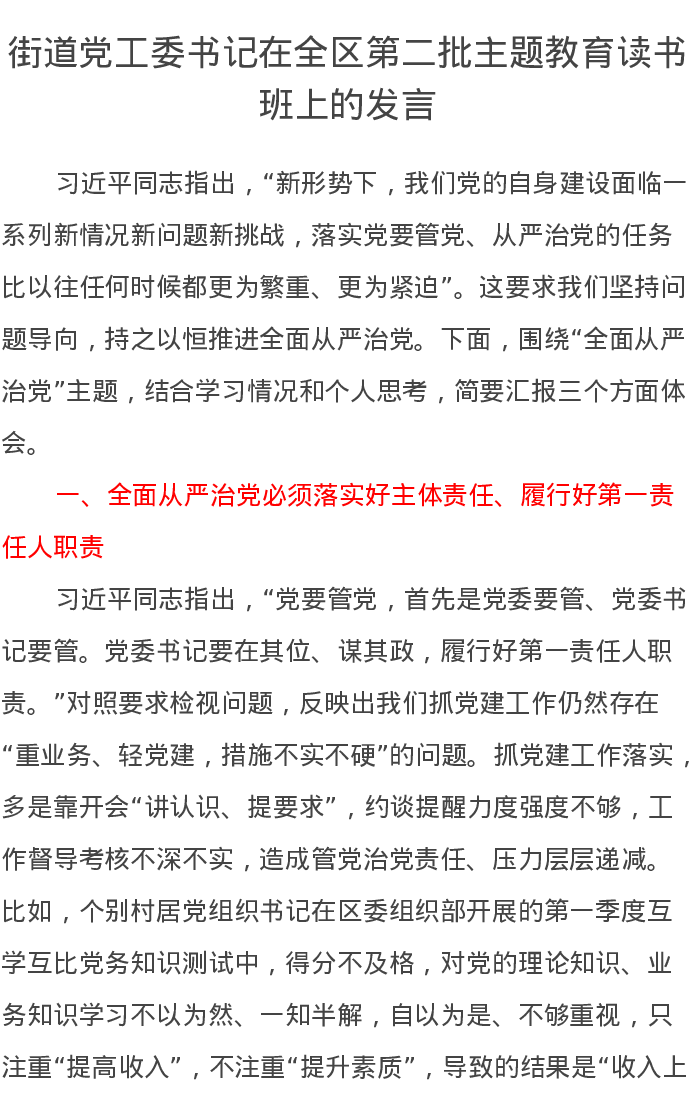 街道党工委书记在全区第二批主题教育读书班上的发言(特色社会主义思想)