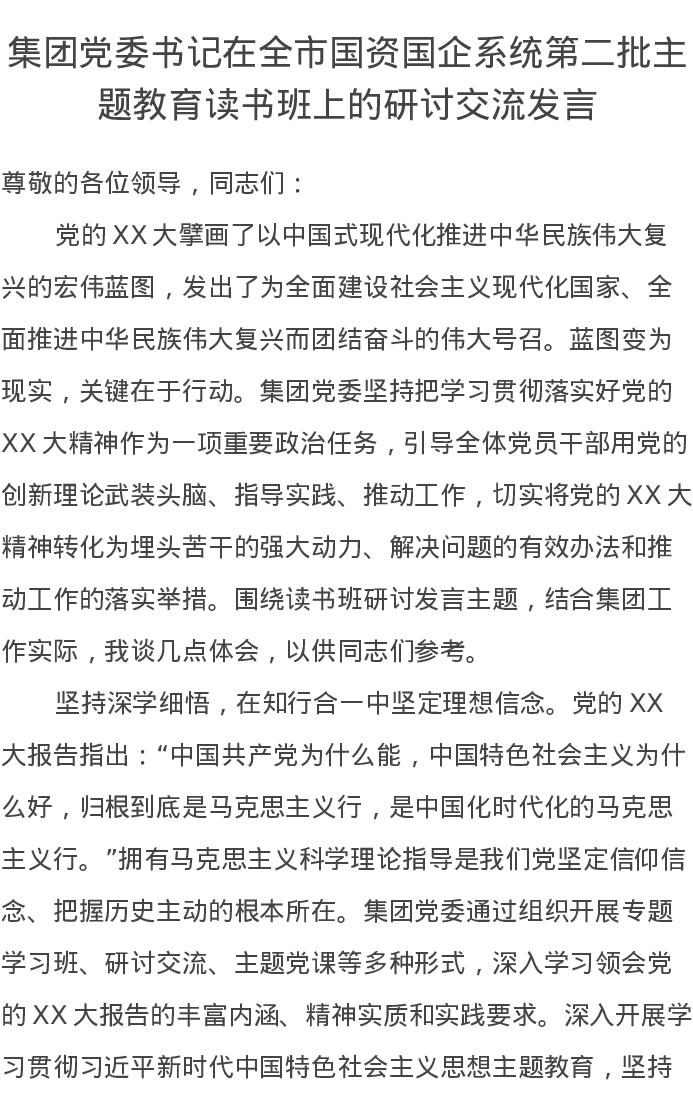 集团党委书记在全市国资国企系统第二批主题教育读书班上的研讨交流发言(特色社会主义思想)