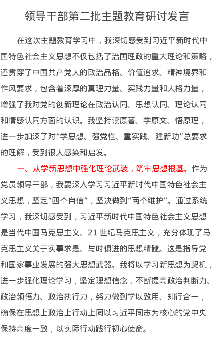 领导干部第二批主题教育研讨发言(特色社会主义思想)