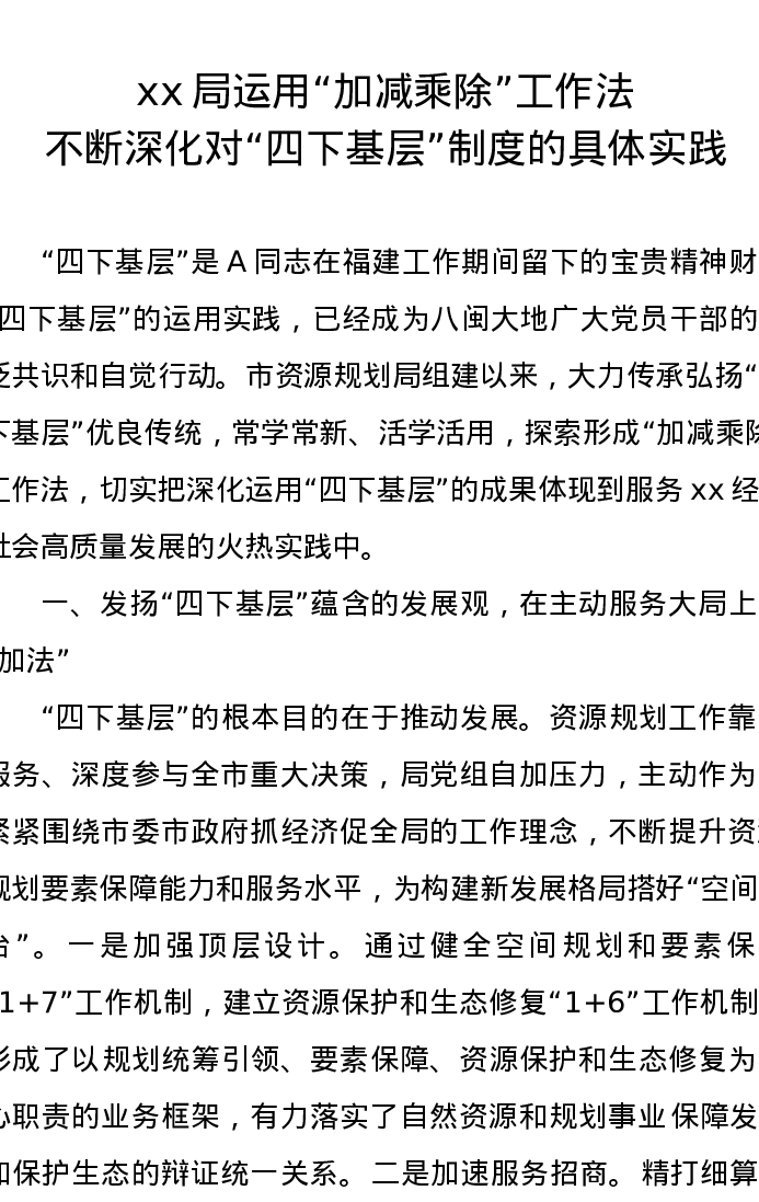 简报:运用“加减乘除”工作法 不断深化对“四下基层”制度的具体实践(特色社会主义思想)主题教育