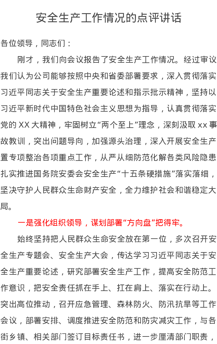 安全生产工作情况的点评讲话