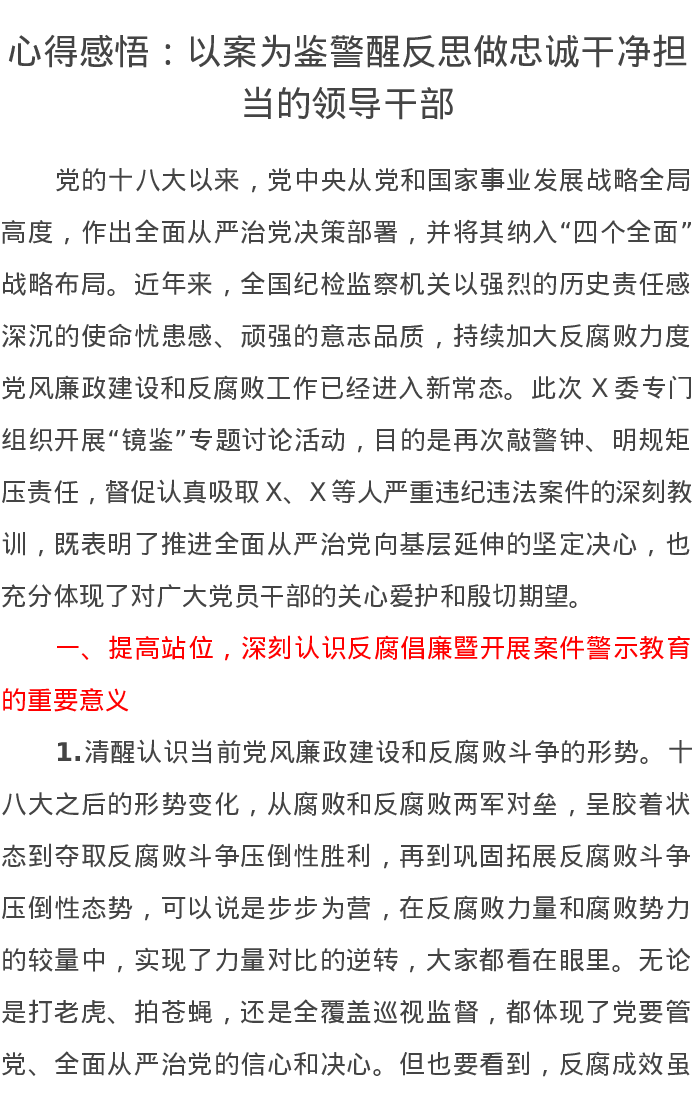 心得感悟:以案为鉴警醒反思做忠诚干净担当的领导干部