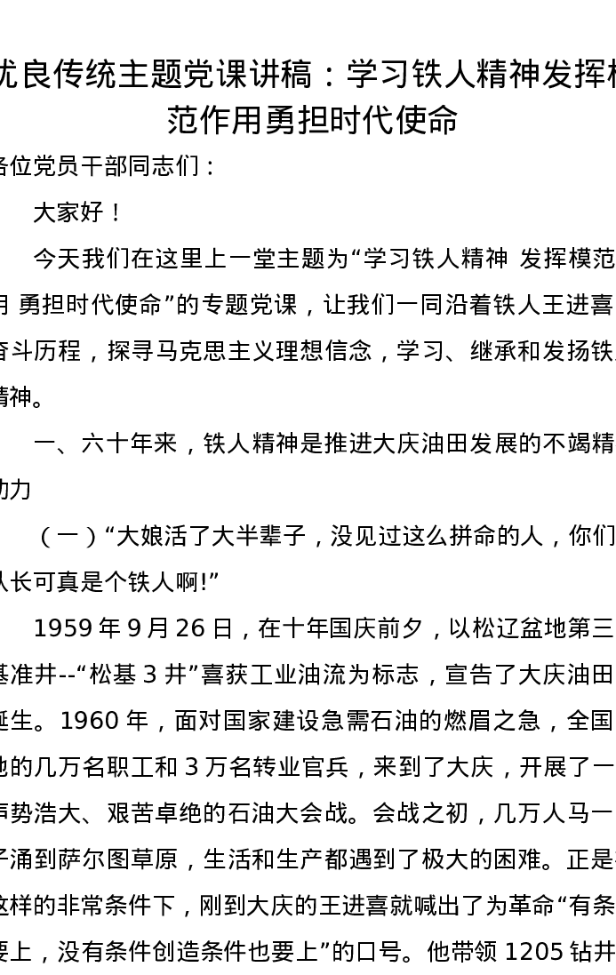 优良传统主题党课讲稿:学习铁人精神发挥模范作用勇担时代使命