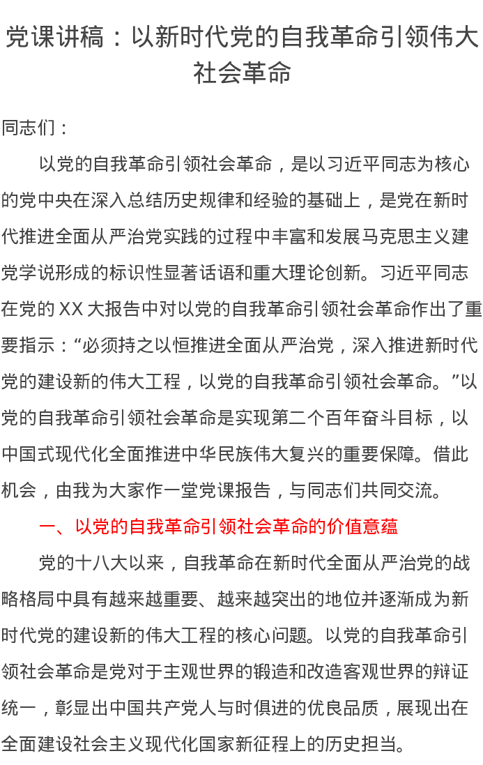 党课讲稿:以新时代党的自我革命引领伟大社会革命