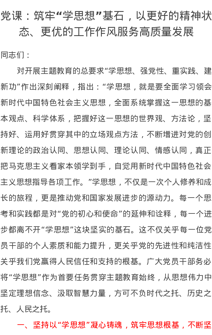 党课讲稿:筑牢“学思想”基石,以更好的精神状态、更优的工作作风服务高质量发展