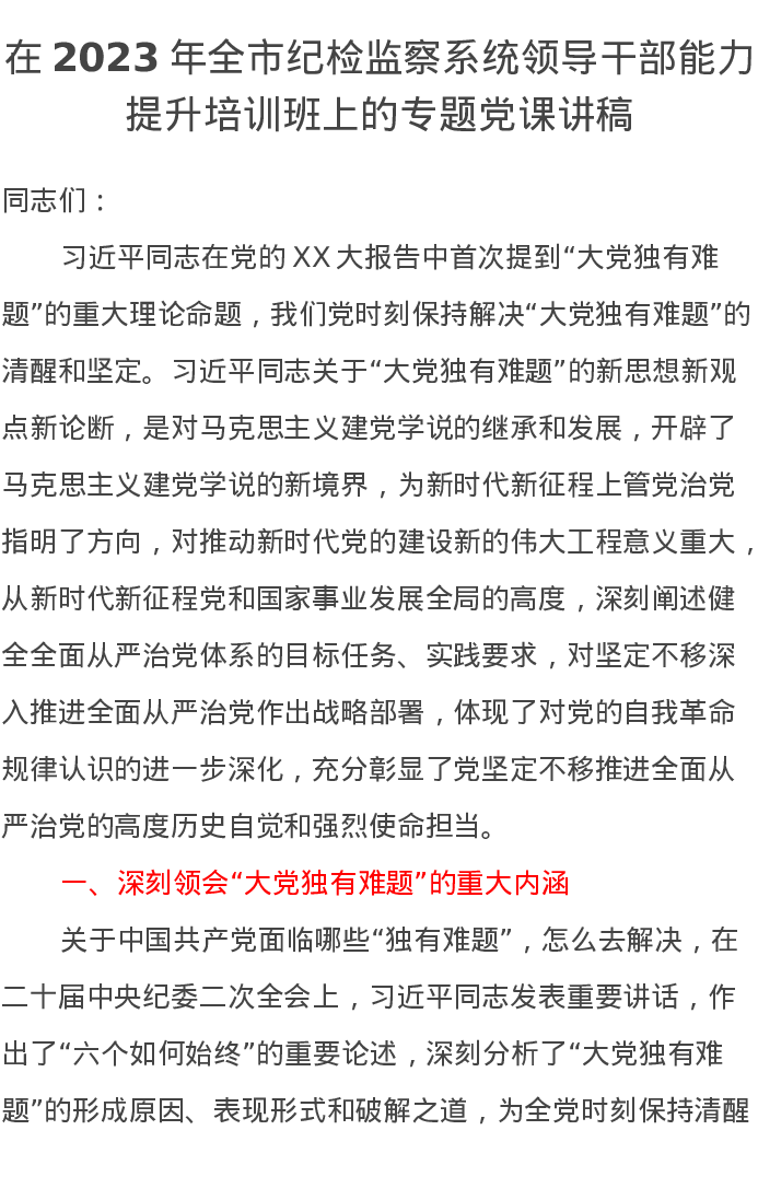 在2023年全市纪检监察系统领导干部能力提升培训班上的专题党课讲稿
