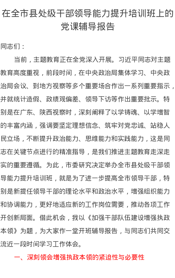 在全市县处级干部领导能力提升培训班上的党课辅导报告