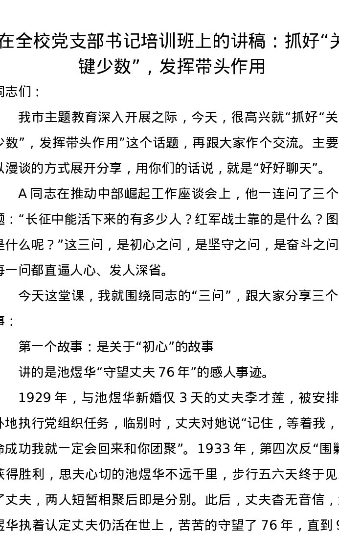 在全校党支部书记培训班上的讲稿:抓好“关键少数”,发挥带头作用