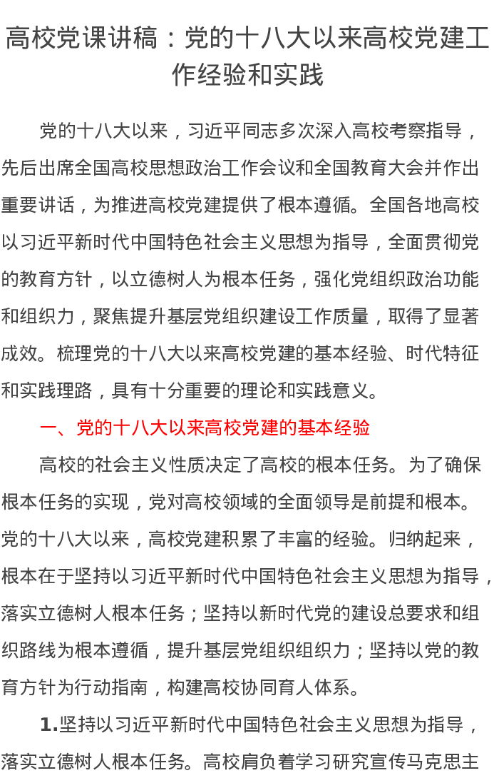 高校党课讲稿:党的十八大以来高校党建工作经验和实践