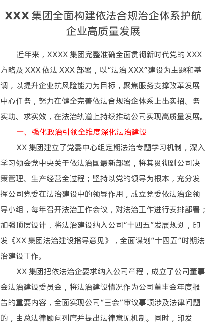 XXX集团全面构建依法合规治企体系护航企业高质量发展汇报