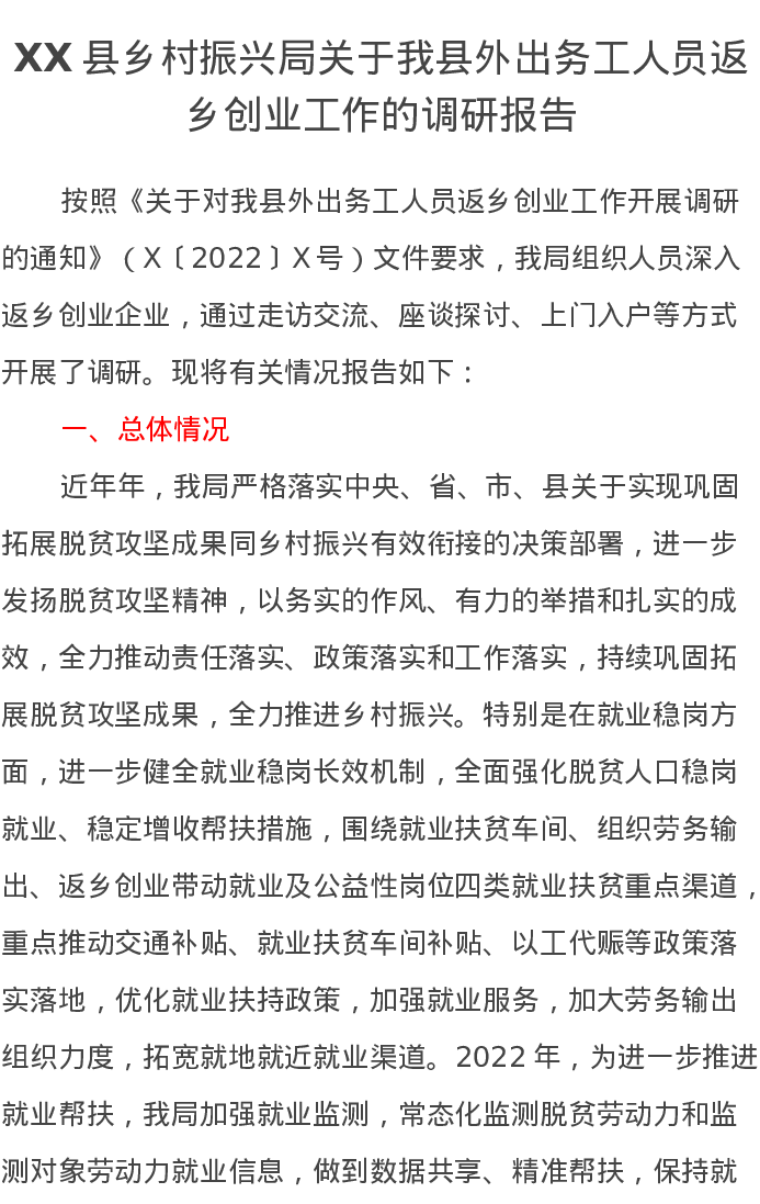 XX县乡村振兴局关于我县外出务工人员返乡创业工作的调研报告