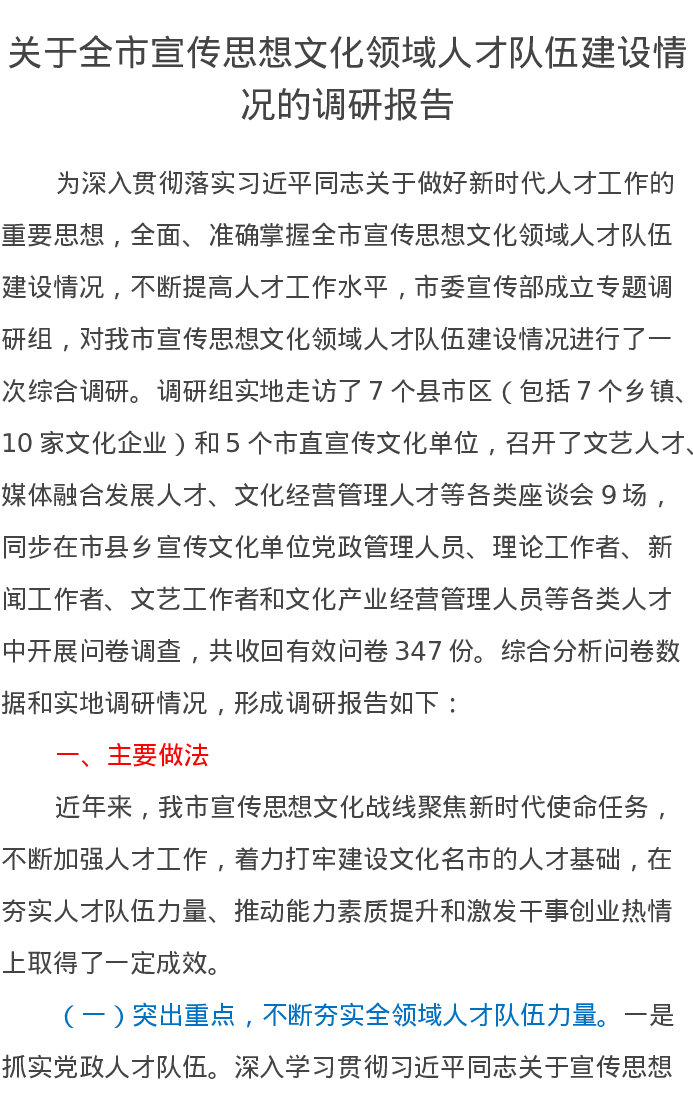 关于全市宣传思想文化领域人才队伍建设情况的调研报告