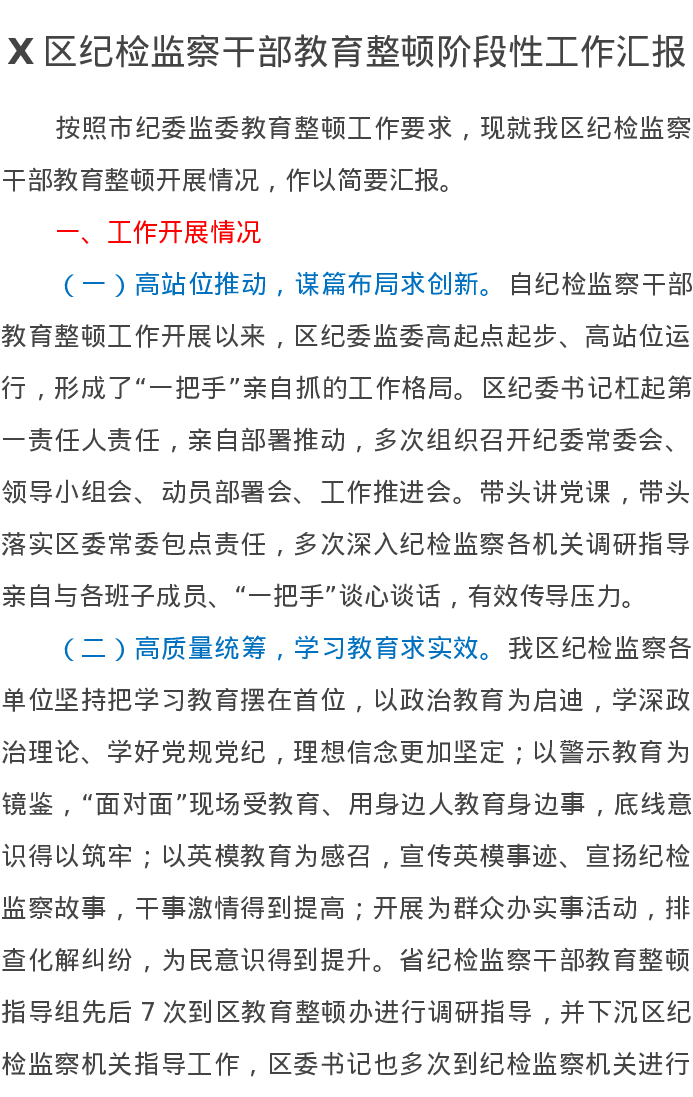 X区纪检监察干部教育整顿阶段性工作汇报