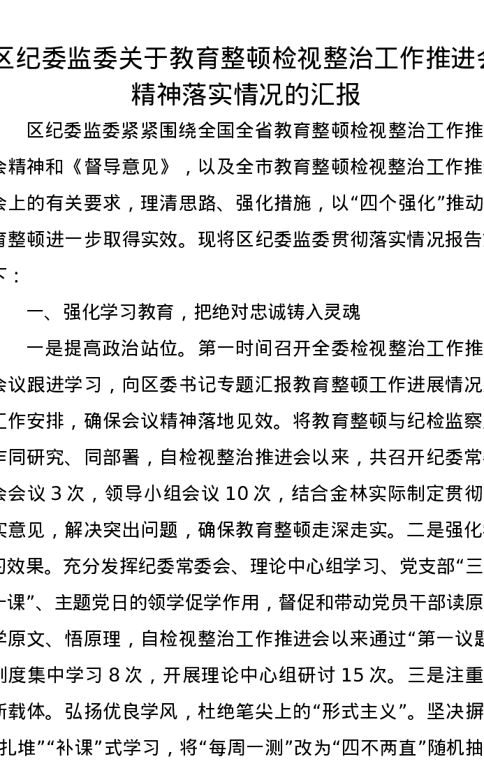 区纪委监委关于教育整顿检视整治工作推进会精神落实情况的汇报