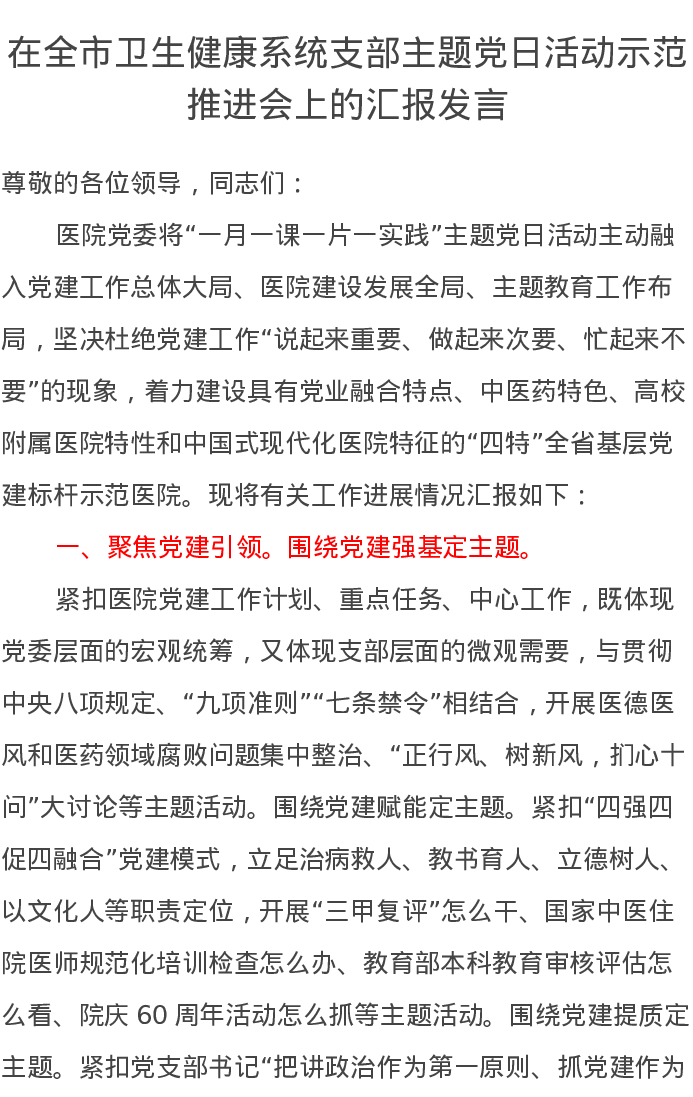 在全市卫生健康系统支部主题党日活动示范推进会上的汇报发言