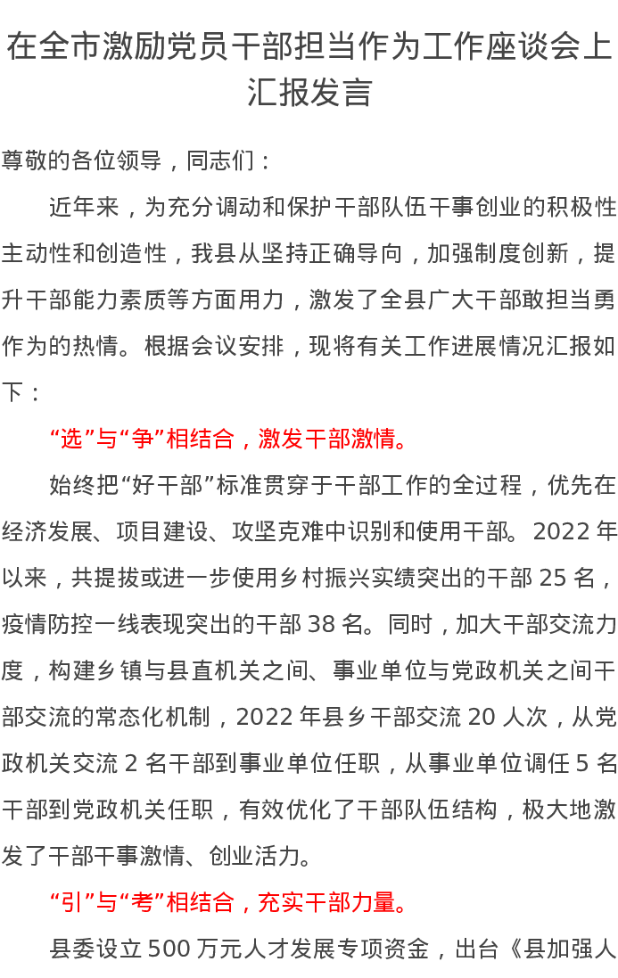 在全市激励党员干部担当作为工作座谈会上汇报发言