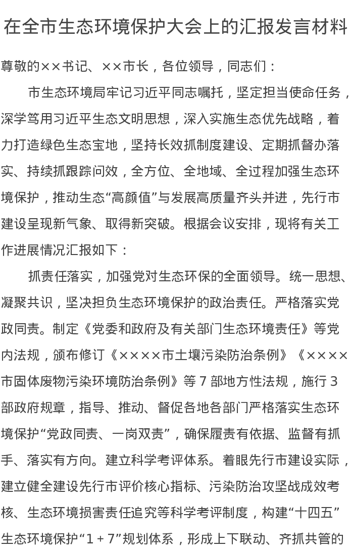 在全市生态环境保护大会上的汇报发言材料