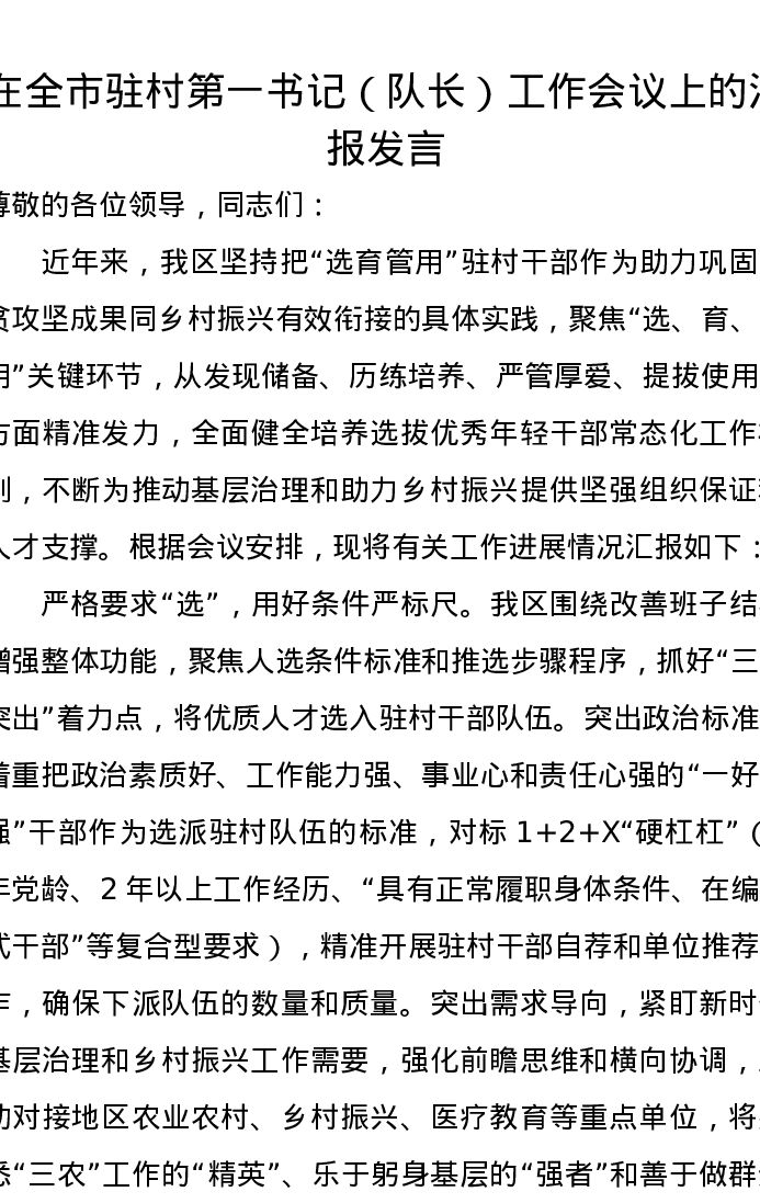 在全市驻村第一书记(队长)工作会议上的汇报发言