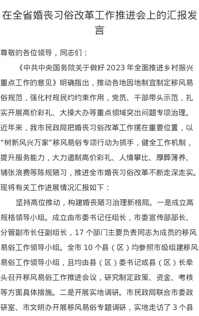 在全省婚丧习俗改革工作推进会上的汇报发言