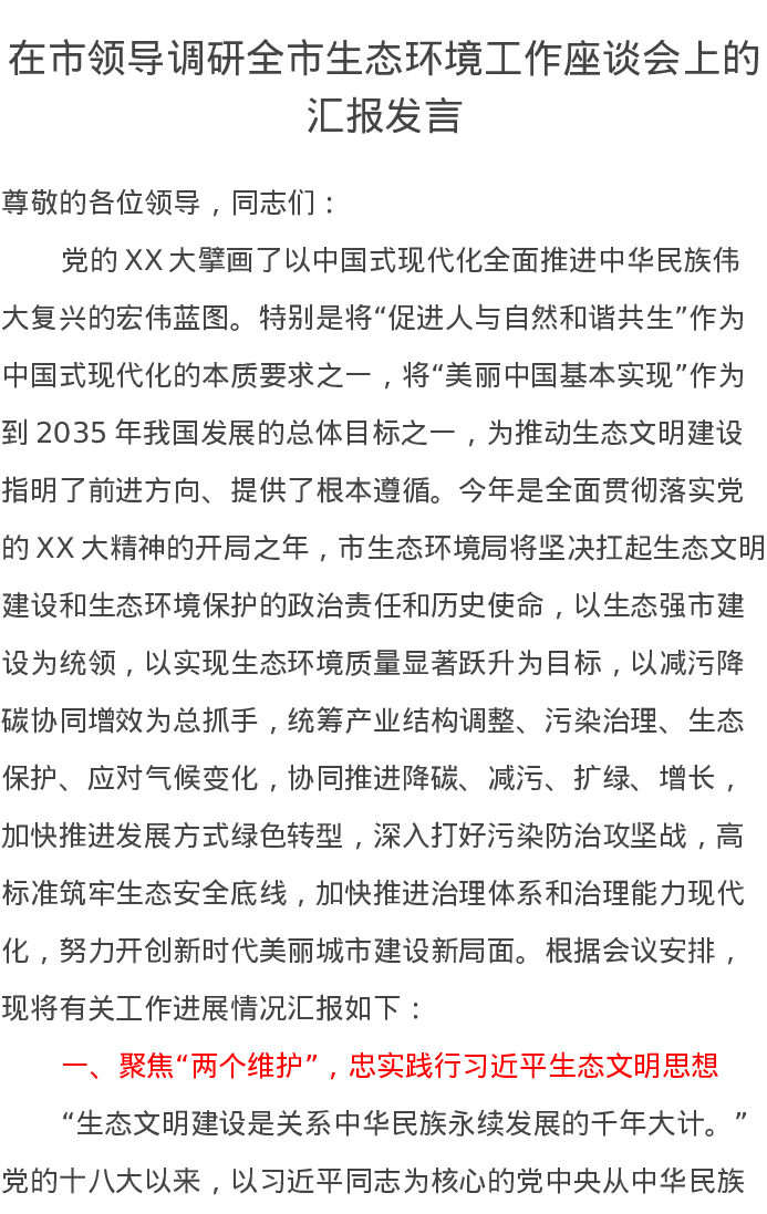 在市领导调研全市生态环境工作座谈会上的汇报发言