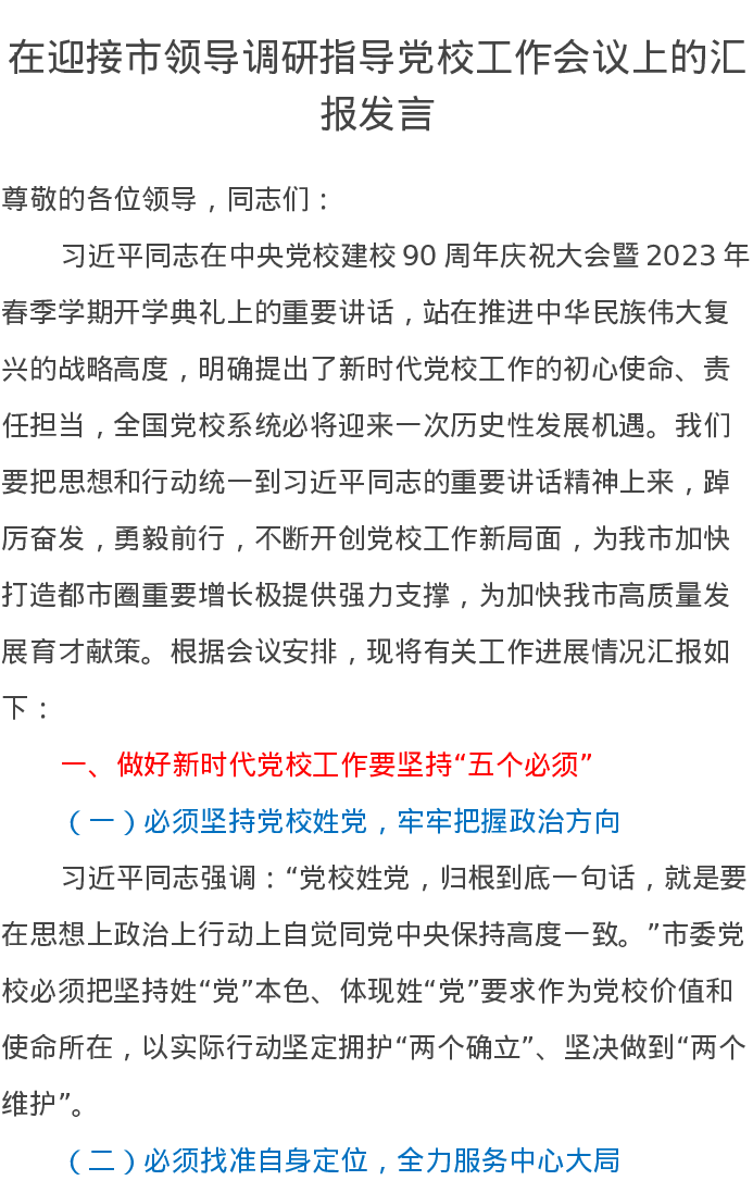 在迎接市领导调研指导党校工作会议上的汇报发言