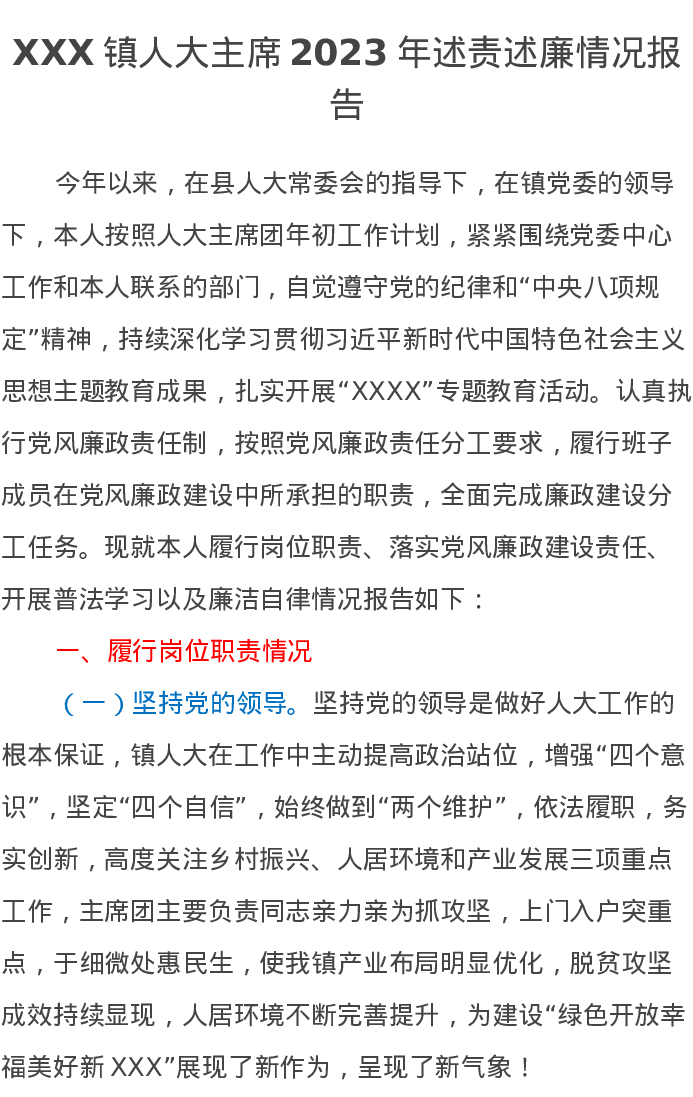 XXX镇人大主席2023年述责述廉情况报告