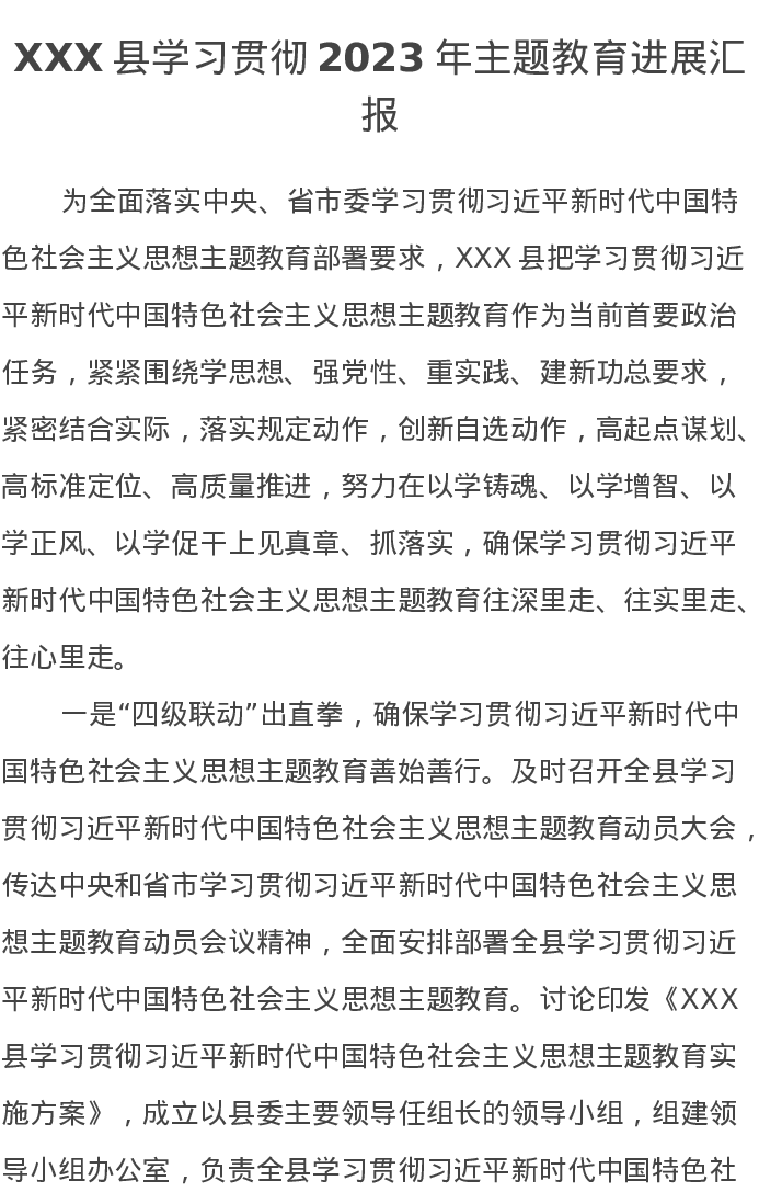 XXX县学习贯彻2023年第二批主题教育进展汇报(特色社会主义思想)