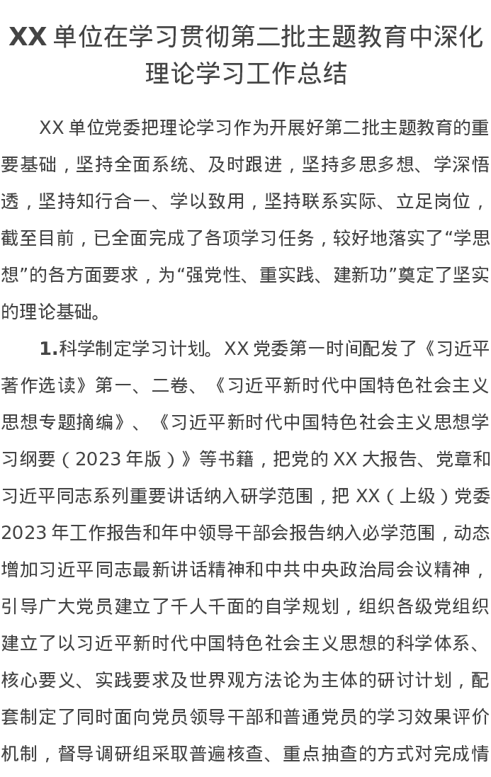 XX单位在学习贯彻第二批主题教育中深化理论学习工作总结(特色社会主义思想)