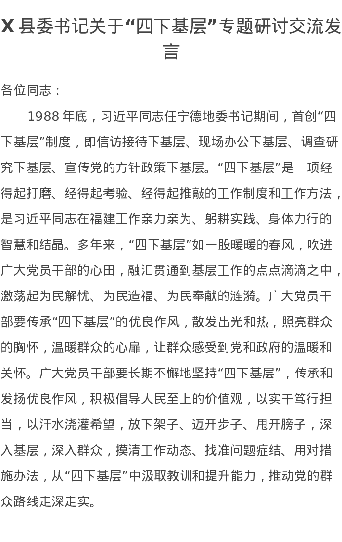 X县委书记关于“四下基层”专题研讨交流发言(特色社会主义思想主题教育)