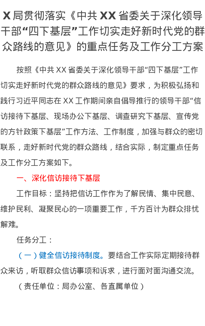 X局贯彻落实第二批主题教育《领导干部“四下基层”工作切实走好新时代党的群众路线的意见》的重点任务及工作分工方案(特色社会主义思想)
