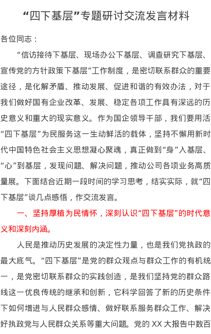 “四下基层”专题研讨交流发言材料(特色社会主义思想主题教育)