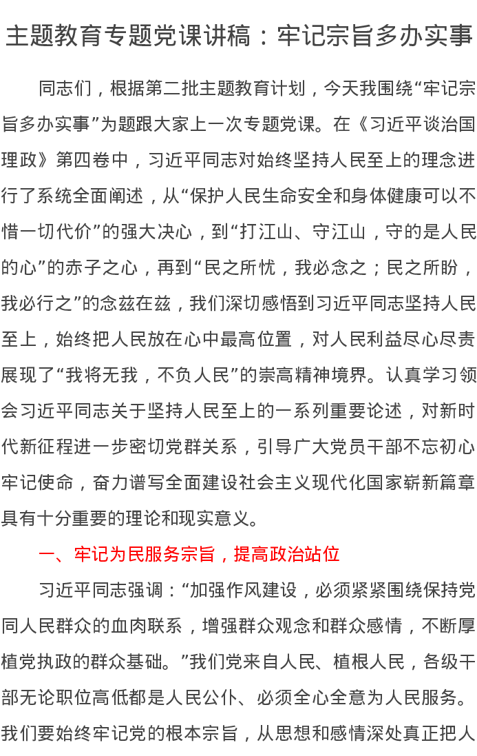 主题教育专题党课讲稿:牢记宗旨多办实事(特色社会主义思想)