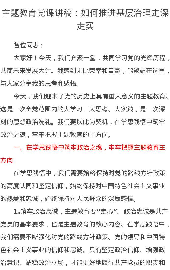 主题教育党课讲稿:如何推进基层治理走深走实(特色社会主义思想)