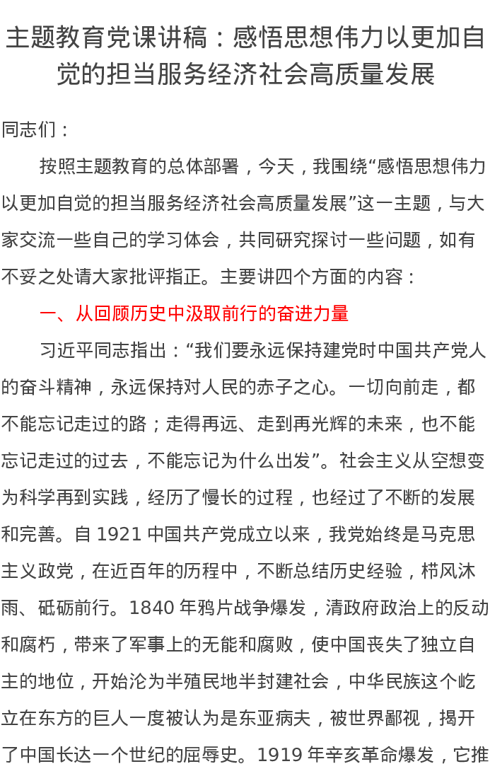 主题教育党课讲稿:感悟思想伟力以更加自觉的担当服务经济社会高质量发展(特色社会主义思想)