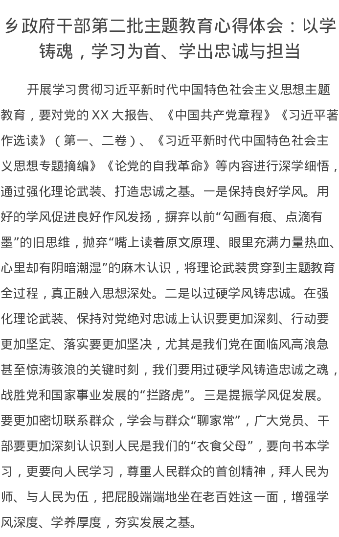 乡政府干部第二批主题教育心得体会:以学铸魂,学习为首、学出忠诚与担当(特色社会主义思想)